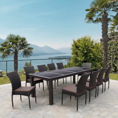 В составе комплекта: стол и 10 стульев с подушками. Высококачественная лоза из полиротанга стойкая к любым атмосферным явлениям. Крепкий стальной каркас с полимерным антивандальным покрытием и отличным качеством сварки. Изделие сплетено вручную нашими мастерами под жестким контролем качества на каждом этапе производства. Лоза максимально приближена по рельефу и текстуре к естественному материалу. Идеально подходит для использования на улице и внутри помещения в любую погоду. Не боится воды, солнца и минусовой температуры.