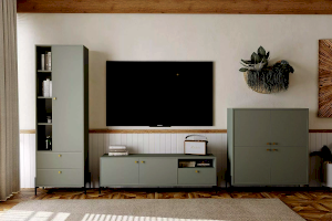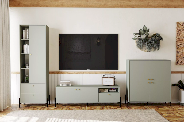 Тумба оснащена двумя полками с распашными дверками, которые закрываются мягко и легко за счет механизма с доводчиком, выдвижным ящиком с системой шариковых направляющих, при помощи которых ящик выдвигается бесшумно, а также открытой нишей. Благодаря комбинации закрытых и открытых ниш можно удобно разместить аудио- и видеоаппаратуры, а также все необходимые книги и предметы интерьера, они не будут разбросаны в хаотичном порядке, а оригинальные высокие опоры обеспечивают быстрый и комфортный доступ при уборке. Дополните тумбу шкафом из одноименной коллекции, чтобы оптимизировать место хранения и создать особо гармоничную атмосферу.