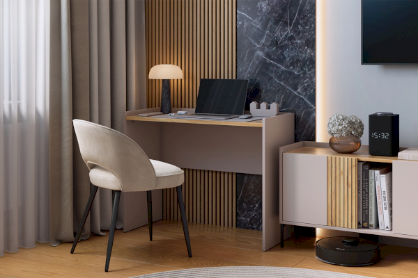 Корпус стола выполнен в цвете кашемир, что придает ему современный и спокойный вид, легко сочетающийся с любым интерьером. Столешница изготовлена из высококачественного материала цвета дуб крафт золотой с толщиной 22 мм, что обеспечивает прочность и устойчивость к повреждениям. Этот цвет добавляет столу теплоту и роскошь, создавая приятное ощущение при работе или учебе.